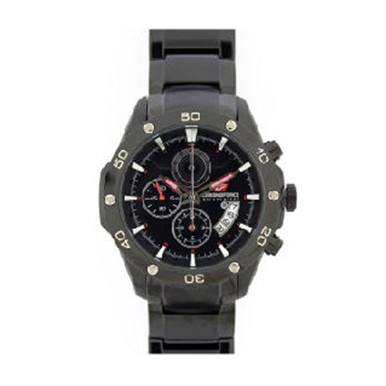 This chronograph watch in solid black wraps your wrist with a mature touch. The dial features a date display and three sub-dials for added utility. It is encircled with a bezel with clear markings.
