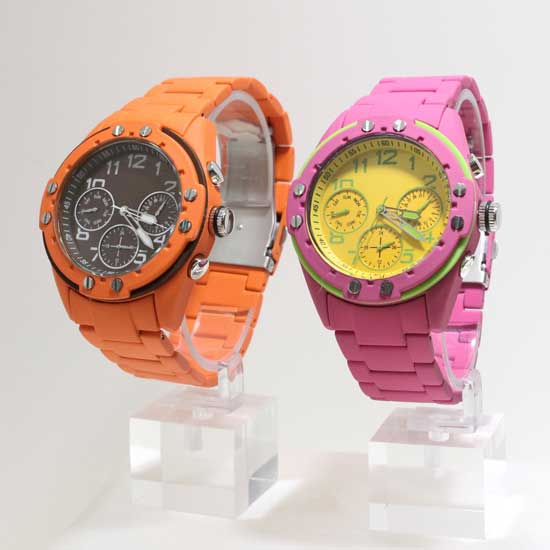 The bright chronograph watch is coated in eye-catching color for a youthful fun style. It comes with 3 sub-dials and the luminous hour and minute hands to offer enhanced visibility in the dark. The silvery decorations on the bezel and crowns easily grab people's attention.