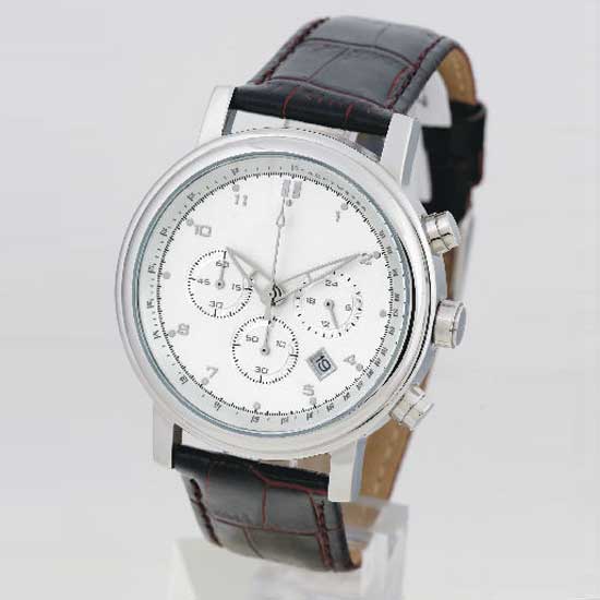 This elegant chronograph watch features a polished steel case with a black genuine leather strap. The white dial showcases three sub-dials, a date display window and three watch hands. This stylish and functional watch is great for everyday wear.