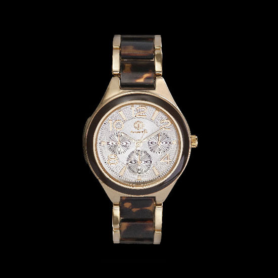 This exquisite chronograph watch has body in gold and brown. Its silvery dial features 3 subdials and golden time indicators. The well-designed watch goes well with your fashionable outfits.