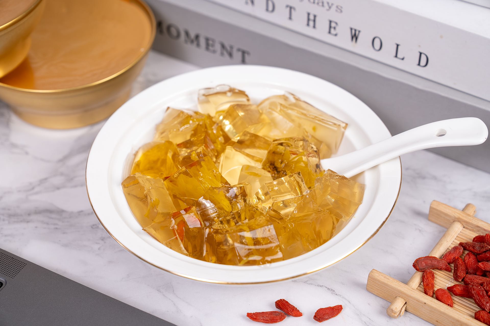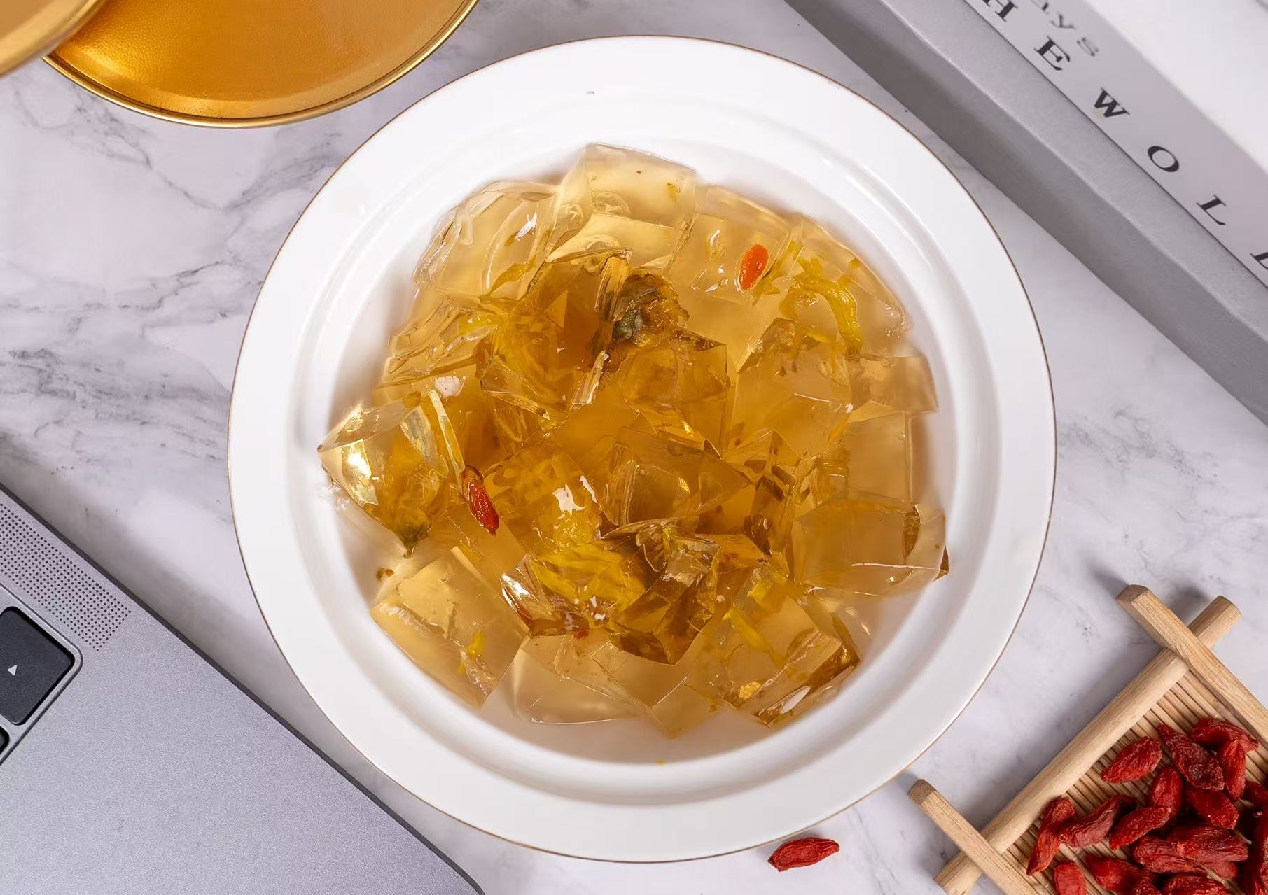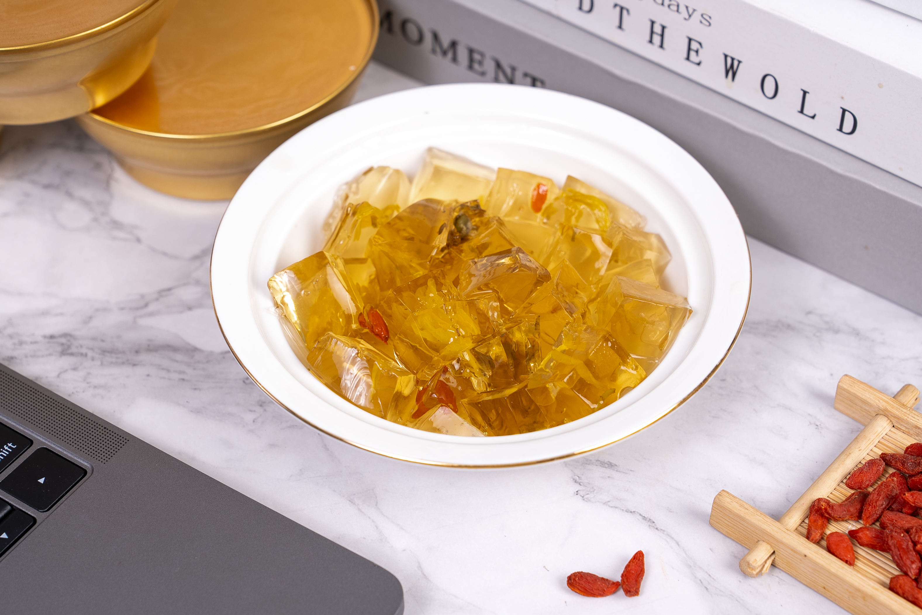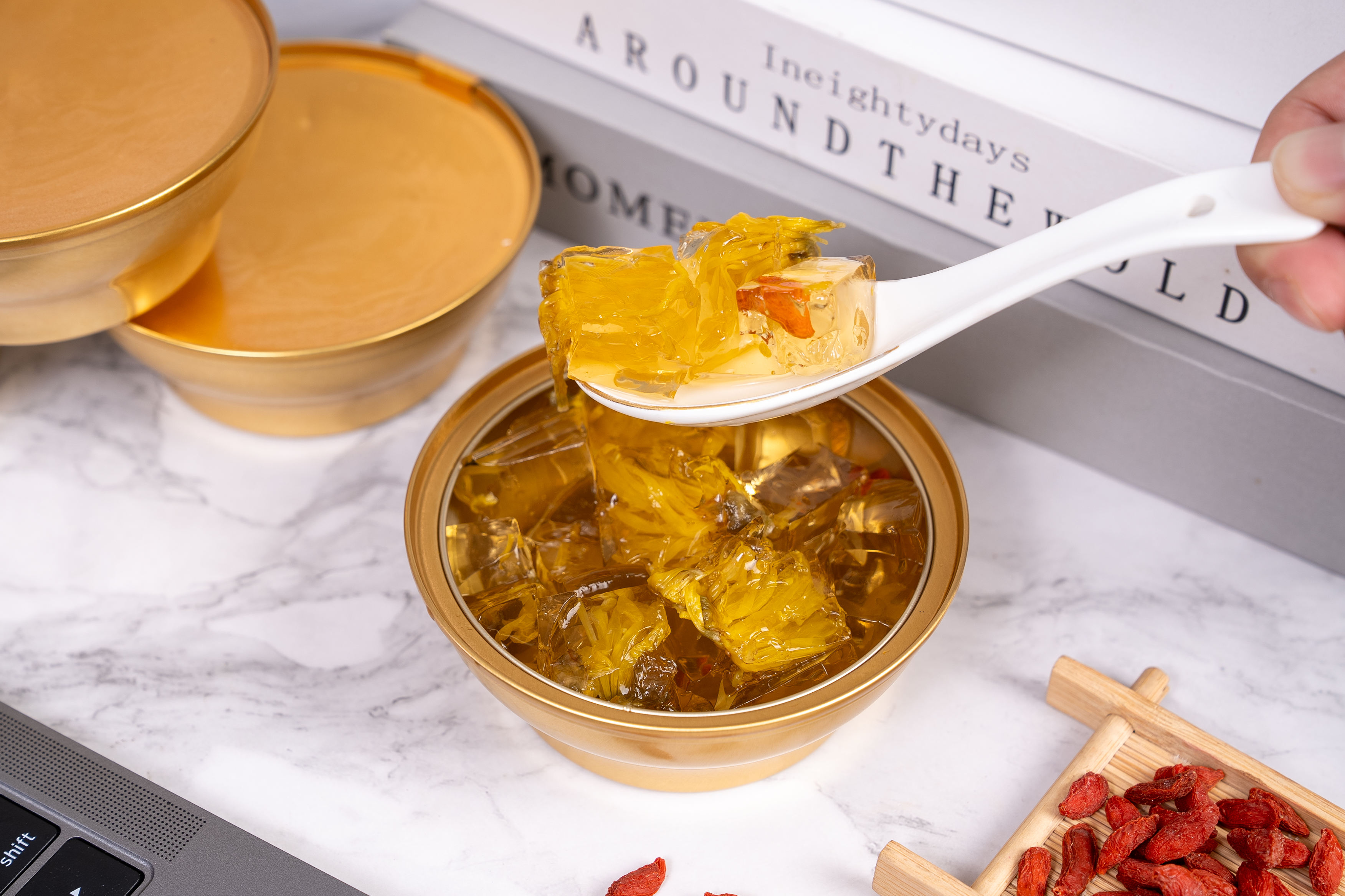 Dendrobium Chrysanthemum Jelly is a refreshing herbal dessert made from selected dendrobium and chrysanthemum. It helps nourish yin, soothe the throat, and relieve eye fatigue, making it suitable for modern urbanites under stress. Ready-to-eat, no refrigeration needed, shelf-stable for 12 months.