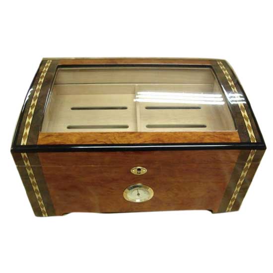 This stunning cigar box is made of MDF with Spanish cedar. It features a beautiful rosewood color and a glossy piano finish. The box comes with a humidifier and hygrometer. There is also a lock for extra security. The piece of tempered glass on the box top helps display your collection.