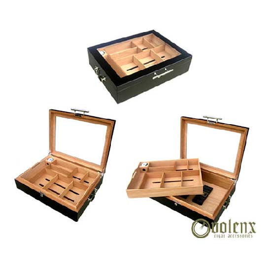 This exclusive cigar humidor is finely crafted of an MDF exterior and Spanish cedar interior. The humidor features a transparent glass window on the top for easy viewing of the cigar inside. It keeps your precious cigar well preserved at the perfect humidity.