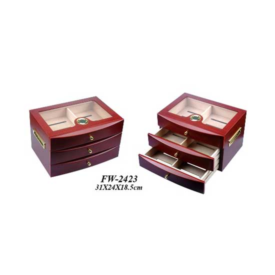 This cigar humidor in a cherry color features a see-through design on the top. It comes with drawers to keep your cigars well-organized. This high-end cigar box is ideal for home use.