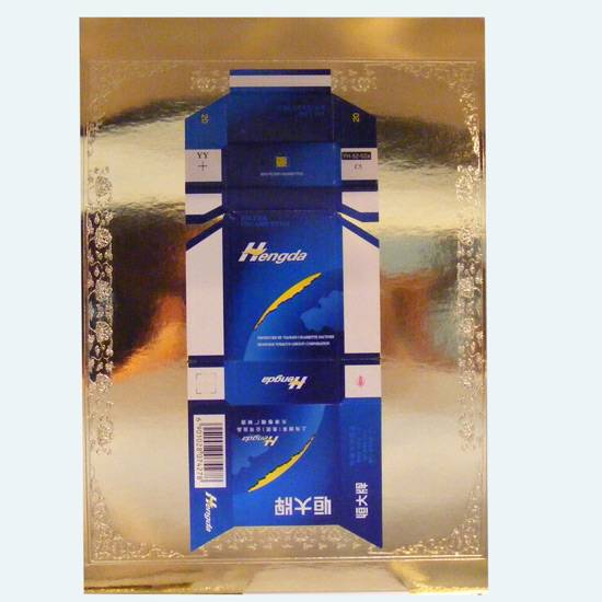 This is a paper cigarette box that can be flattened out. It is blue in color and has the product name all around the packaging.