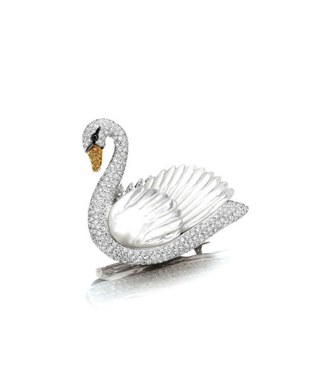 The Swan: sinuous snow-white wings obtained by patiently chiseling the natural mother-of-pearl, body in diamonds set on white gold, bill in yellow gold and green diamonds. Just one star or, better still, two: Nature and the woman who will have the pleasure of wearing it.