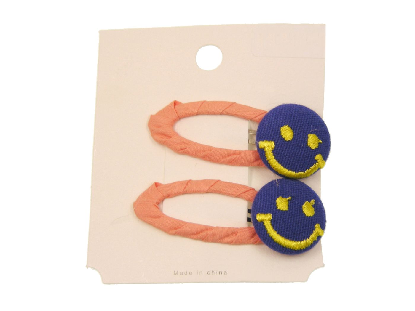 These hair clips feature a vibrant, high-contrast design, with orange-pink (or salmon pink) fabric-wrapped clips and bold dark blue circular smiley face motifs.