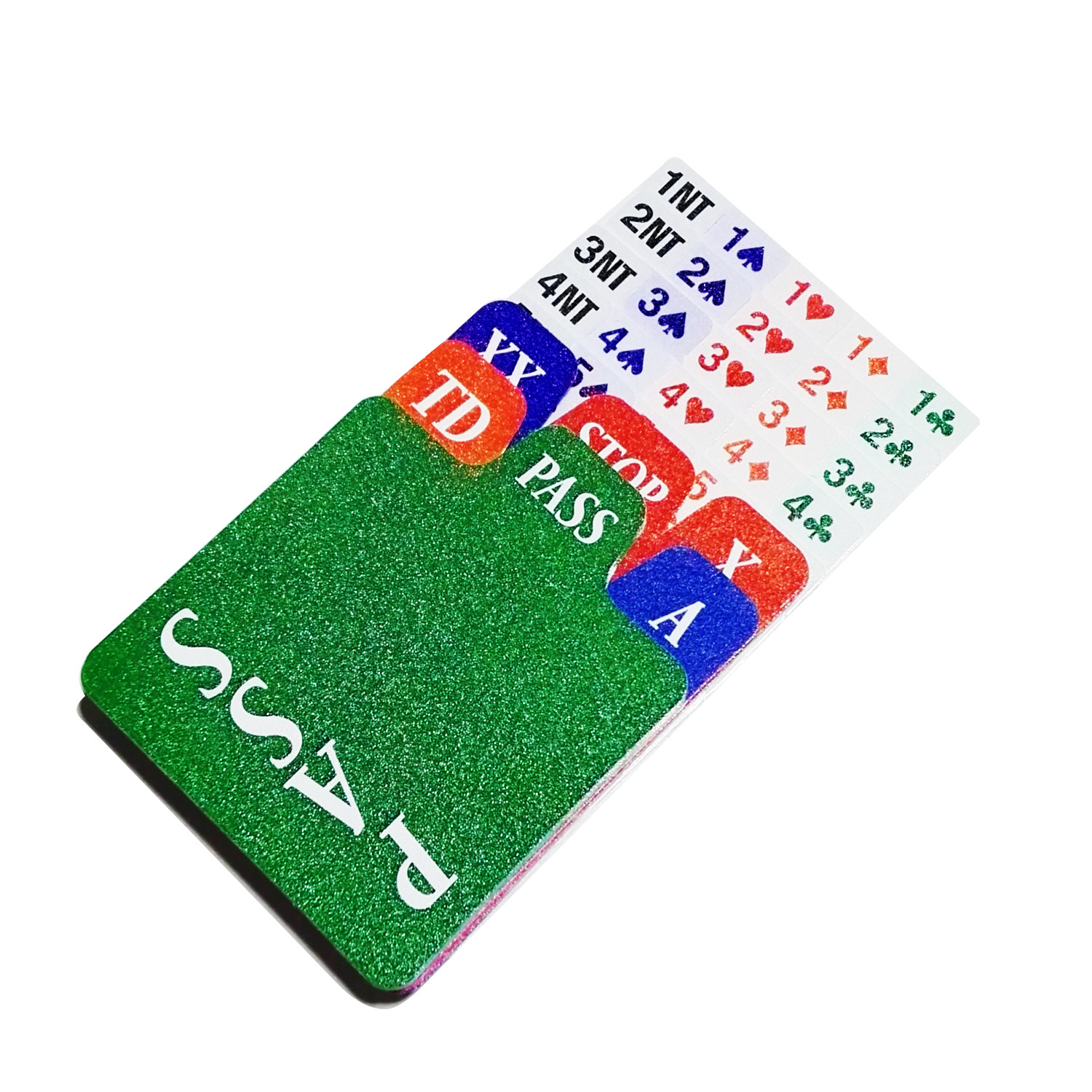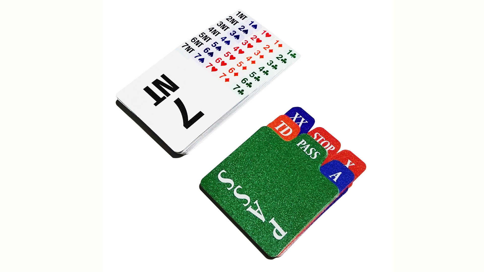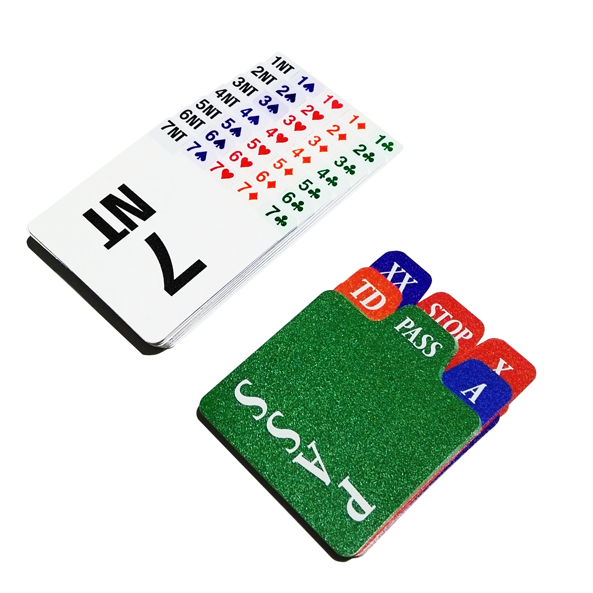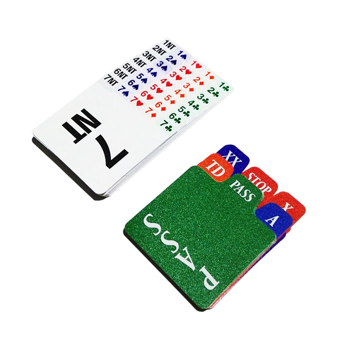 CONTRACT BRIDGE SCORES ON BACKSIDE: TSB bridge replacement bidding cards are produced for all bridge bidding boxes and bidding devices.We print contract bridge scores on the backside of each bidding cards. This makes it easy for bridge players to calculate bridge scores and get final points for every bridge game.