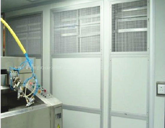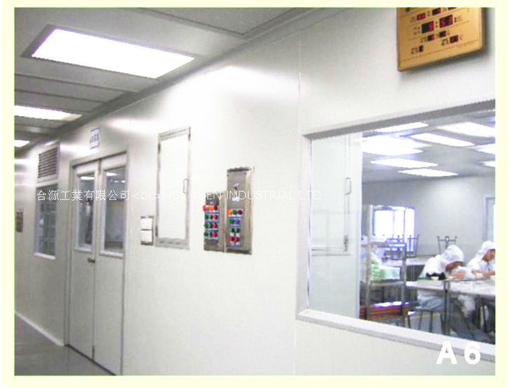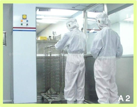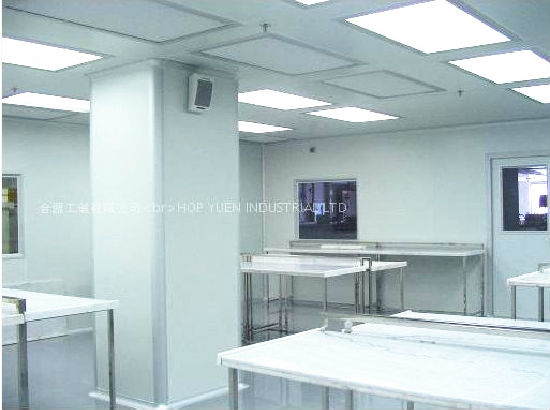 (B) Material and auxiliary equipment for clean room Material that is not susceptible to cracking or the adherence of particles and which creates little dust is employed for the ceiling, walls and floor. When necessary, such auxiliary equipment as air showers in the entrances and pass-boxes in the walls must be installed.