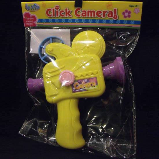 This is a clicking camera toy featuring a shape of the realistic video camera. This click camera toy is designed to entertain your children with attractive mini films for hours. The camera is the perfect birthday gift item for your little kid.