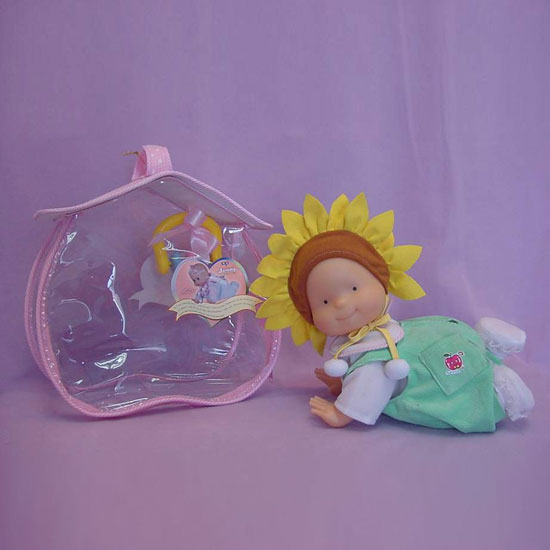 Featured is a toy doll that can crawl. The little doll is wearing lovely clothes with a sunflower hair accessory. This petite doll makes friend with your crawling baby easily.