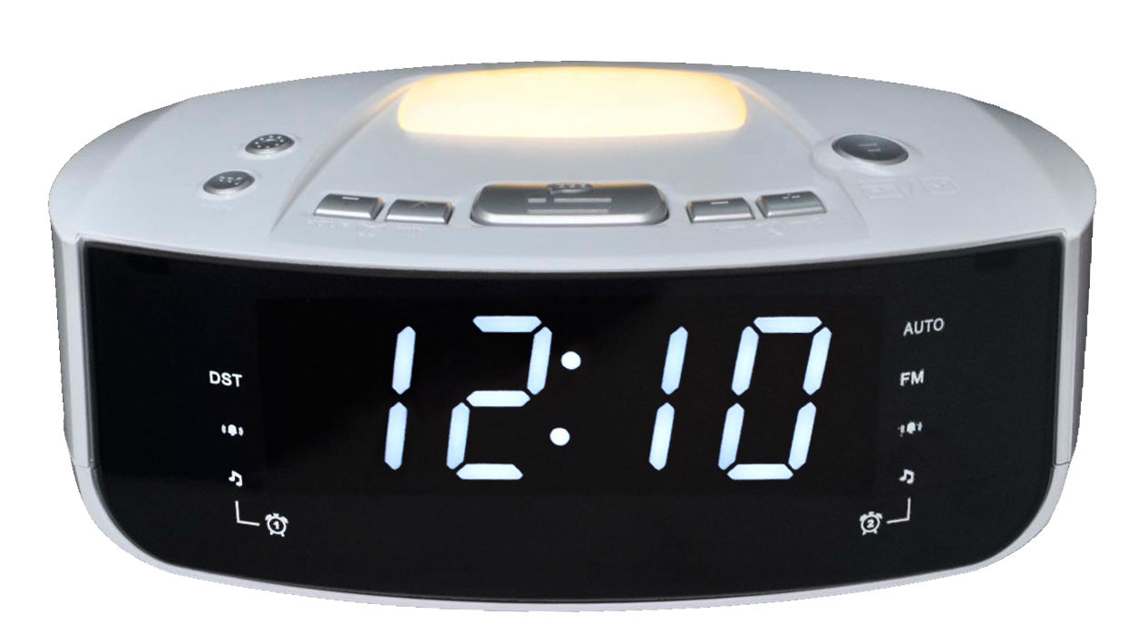 1.2" LED display Single PLL FM radio with 10 preset stations Twin speakers Audio input for music playback, just plug in with USB slot for phone charging with night light and sunrise alarm function Auto & manual search station Snooze and sleep function clock display with 3 range dimmer - high/middle/low dual alarm, wake to buzzer or radio Built in power transformer