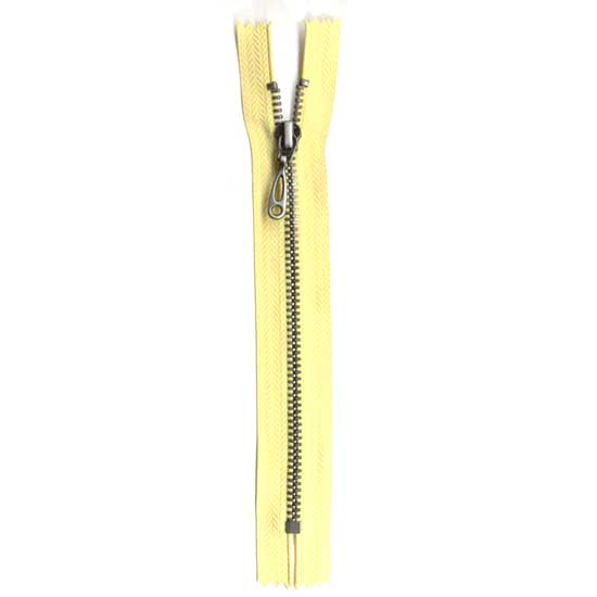 This cream yellow metal zipper is an easy-match zipper for garments and bags in most colors. This close-ended zipper bestows smooth up and down movements with the stoutly made nickel teeth and slider. This metal zipper guarantees sturdy construction and long-lasting serving time, making it an ideal item for your luggage closure.