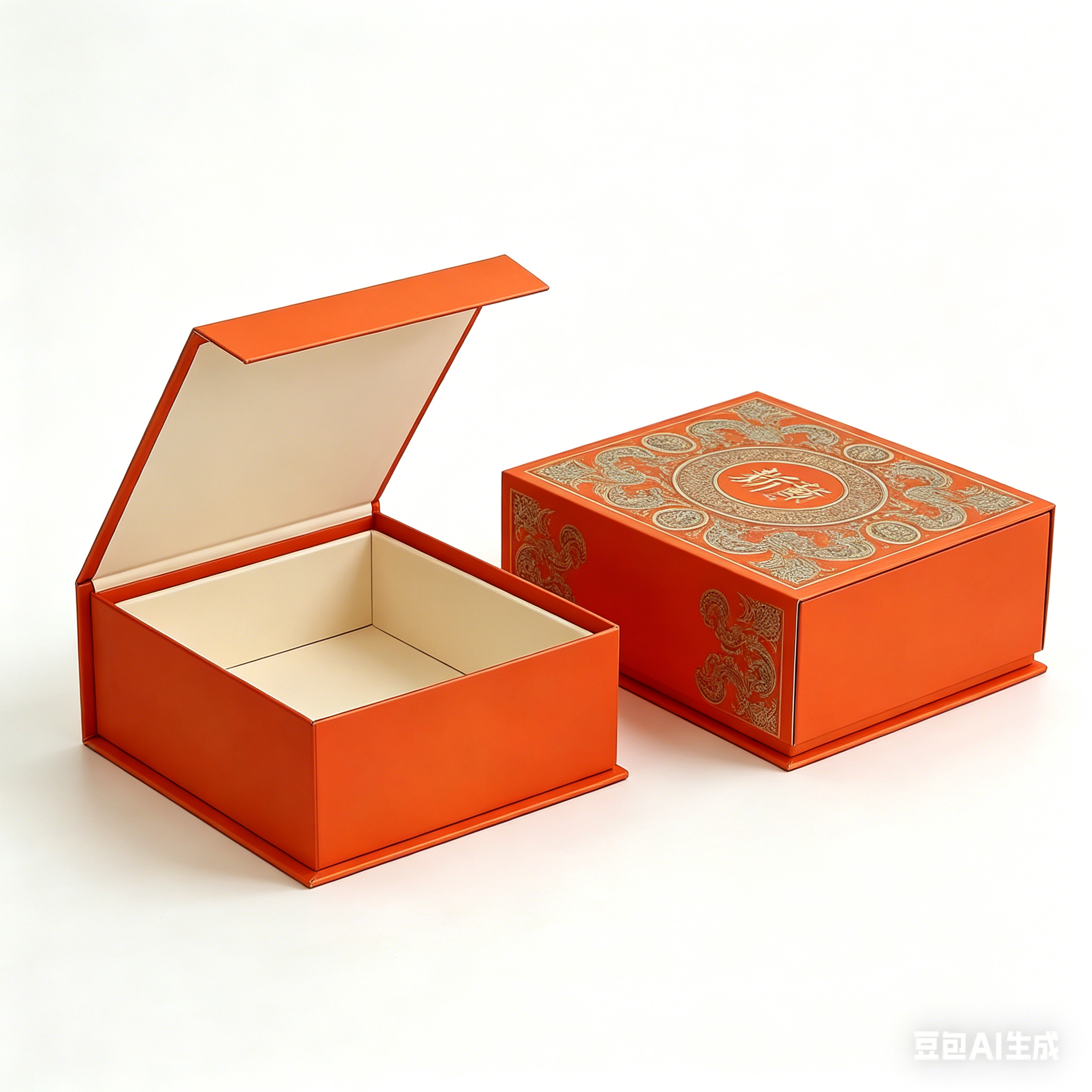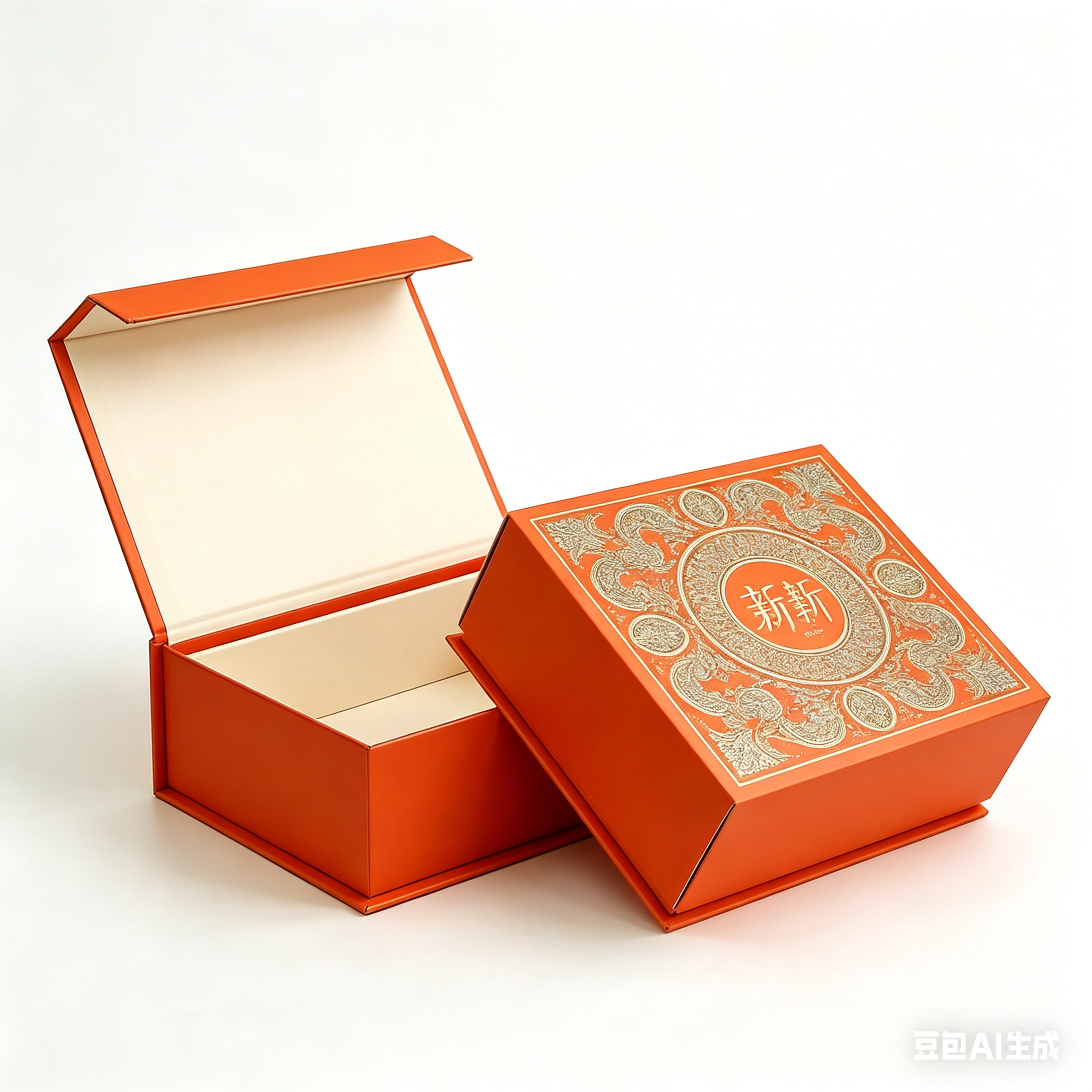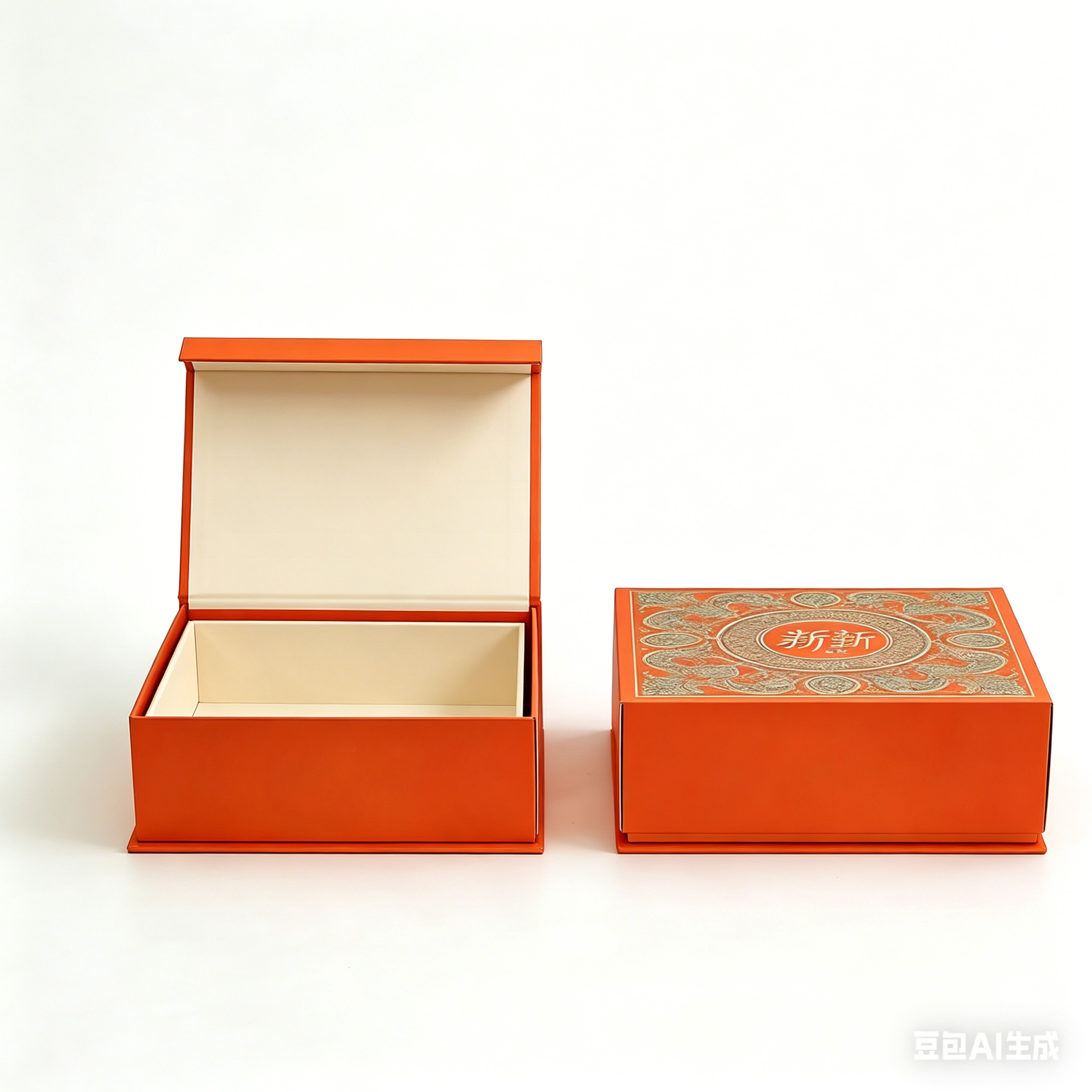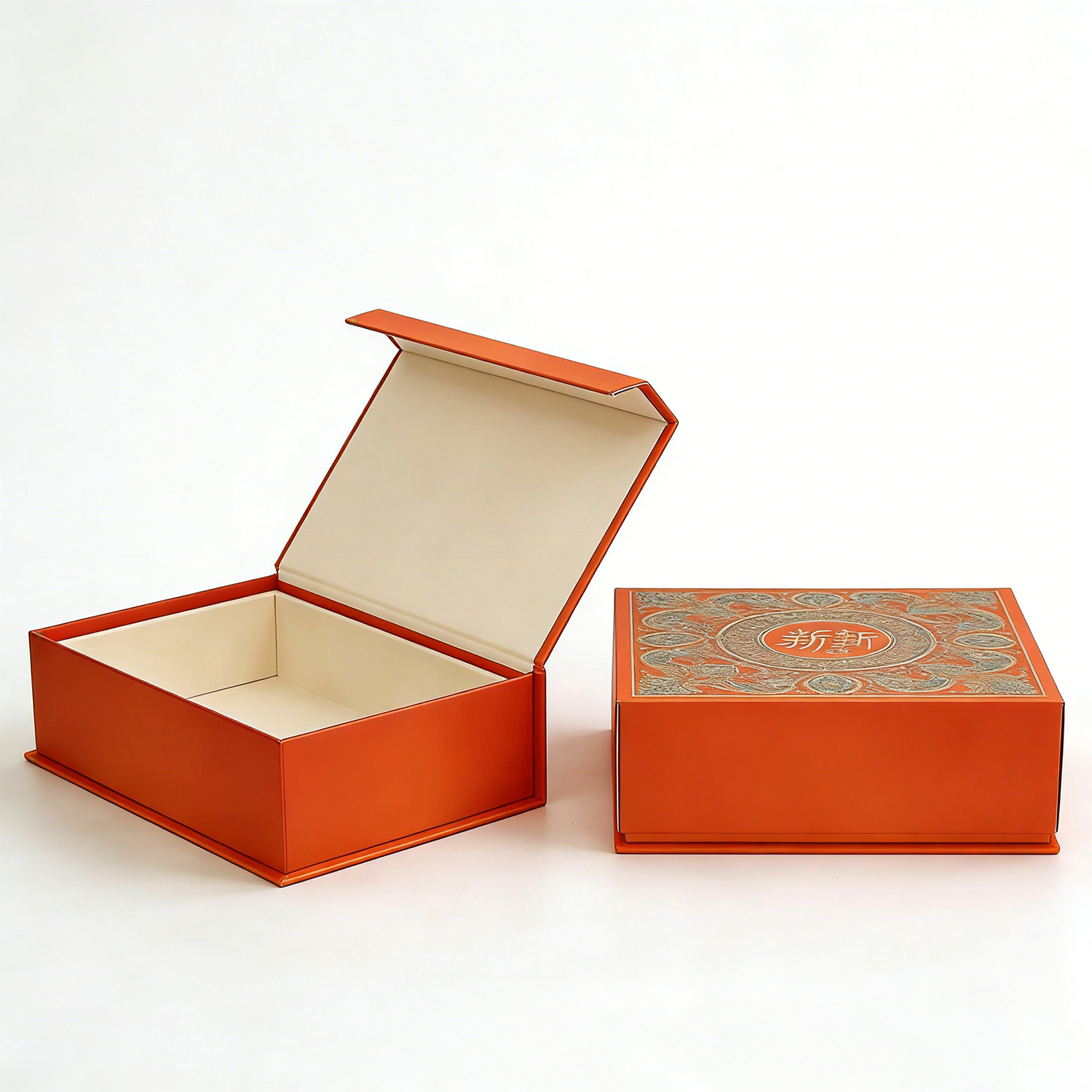 The visual impact of this packaging is immediate and striking. The exterior is wrapped in a high-quality, vibrant orange paper stock.