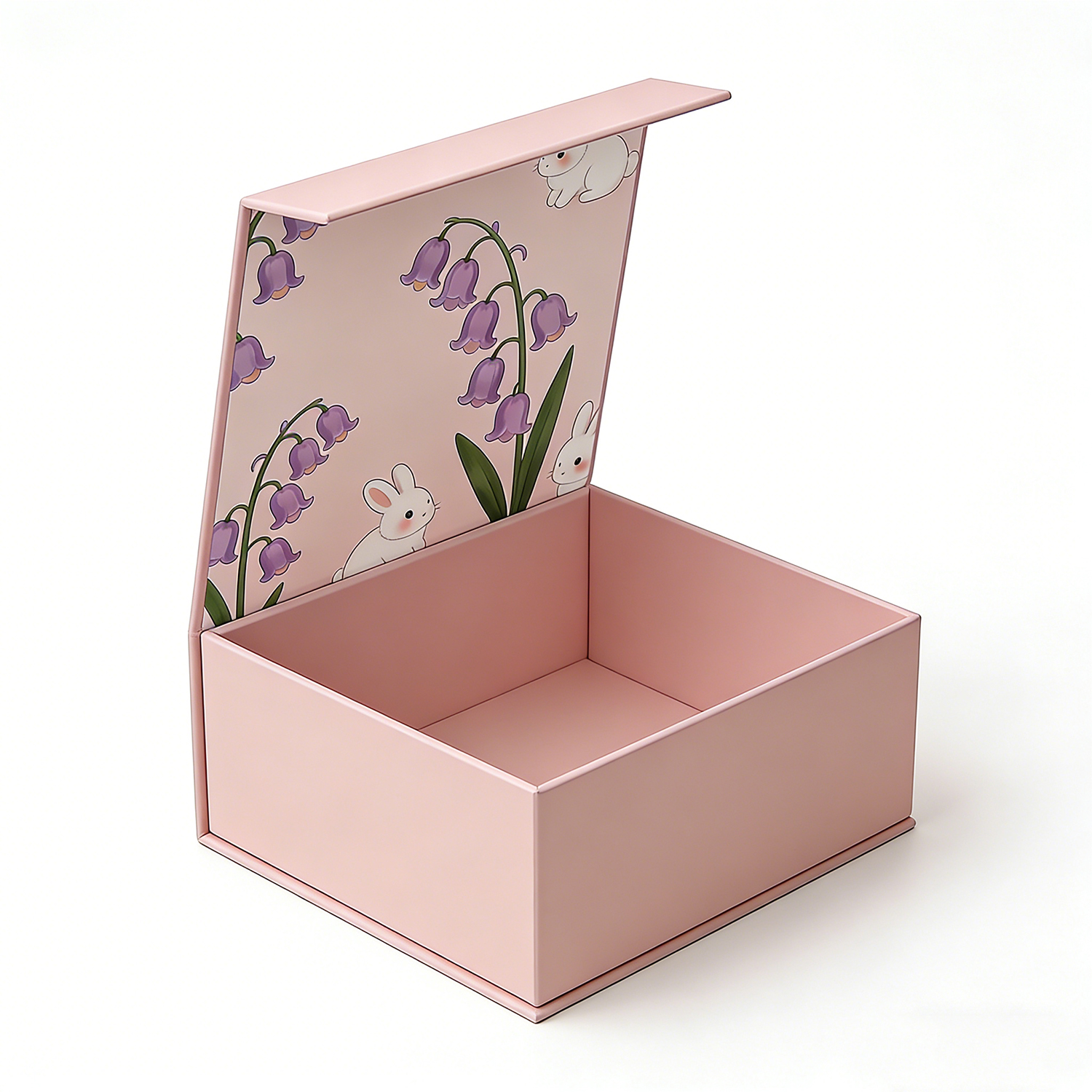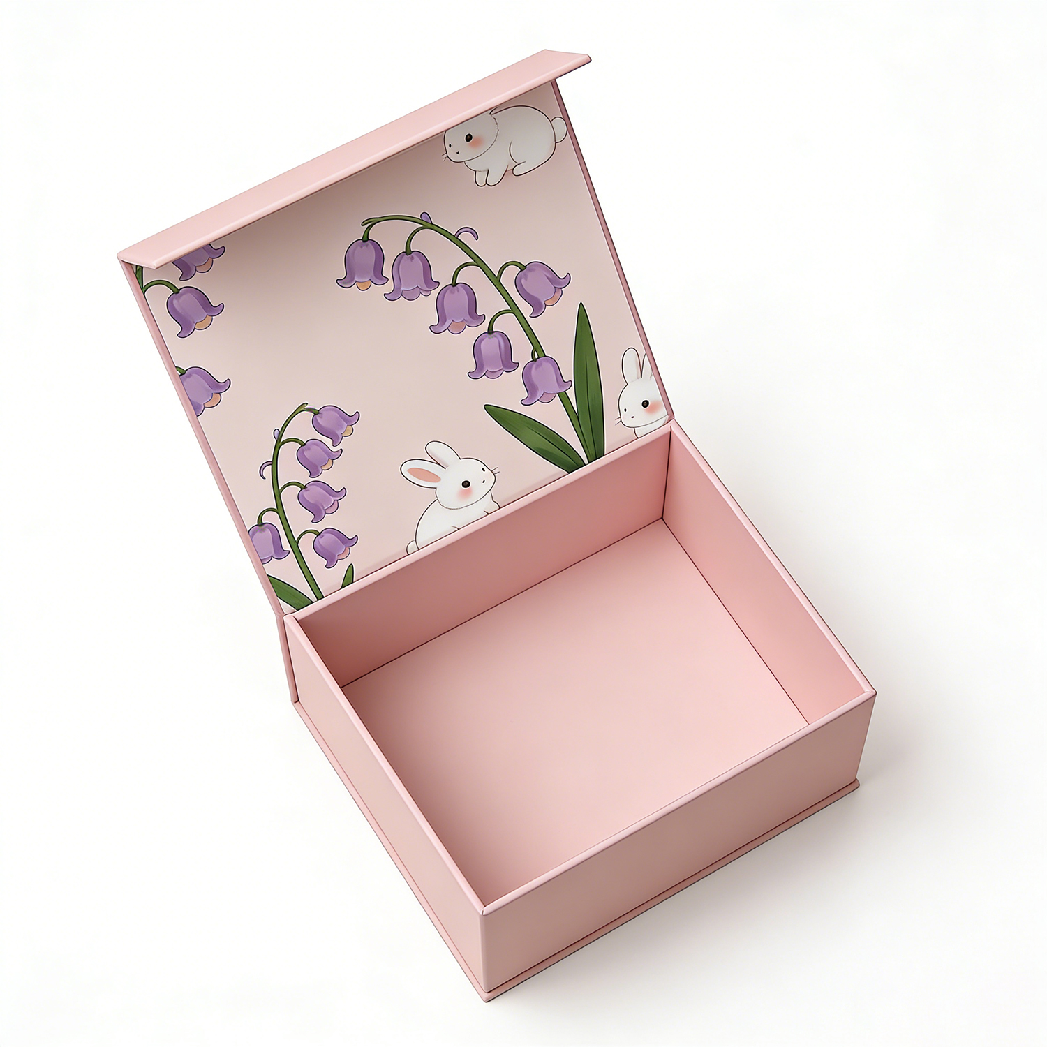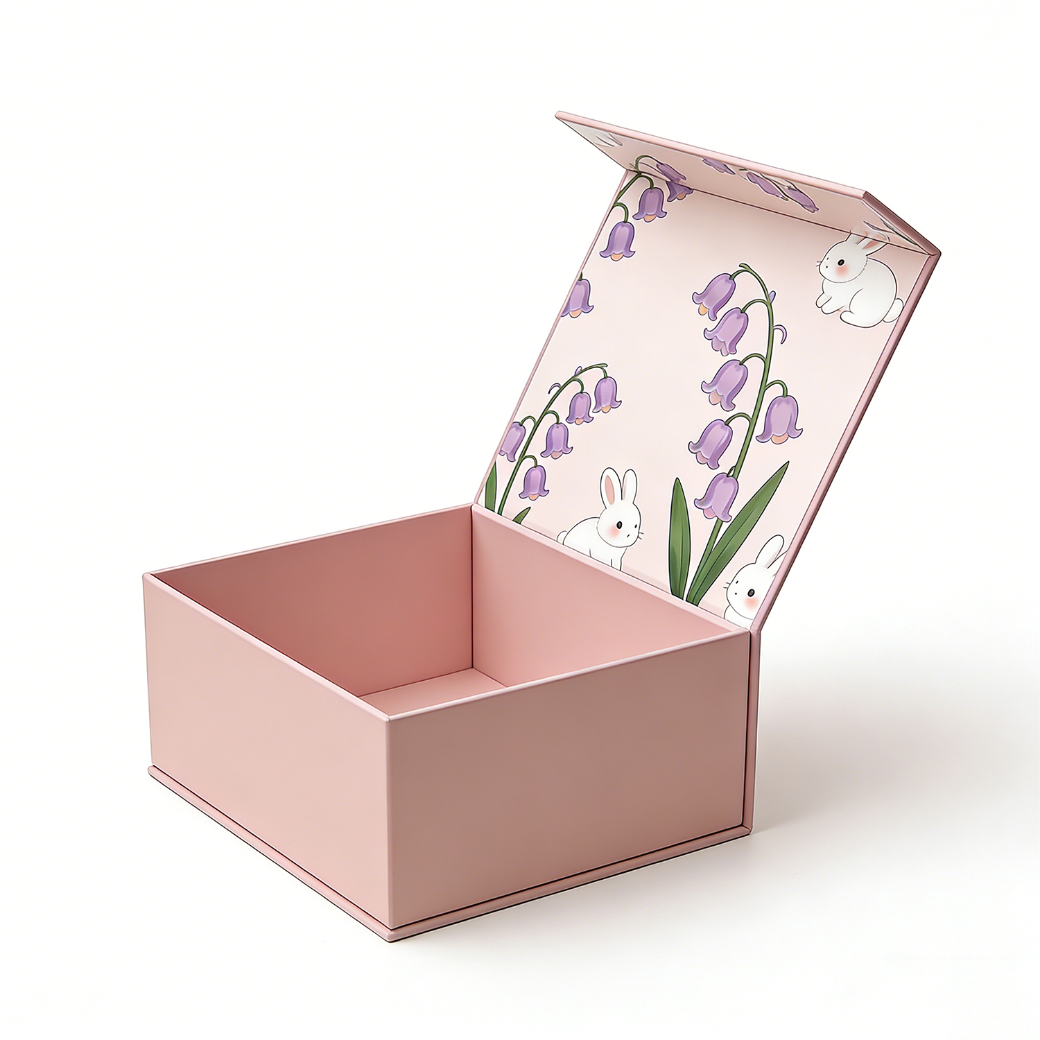 Designed to elevate the presentation of fine jewelry, this premium rigid box features a delicate pastel pink finish complemented by an enchanting interior illustration of soft florals and adorable bunny motifs.