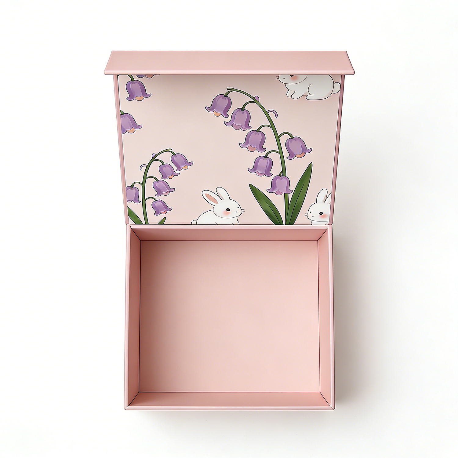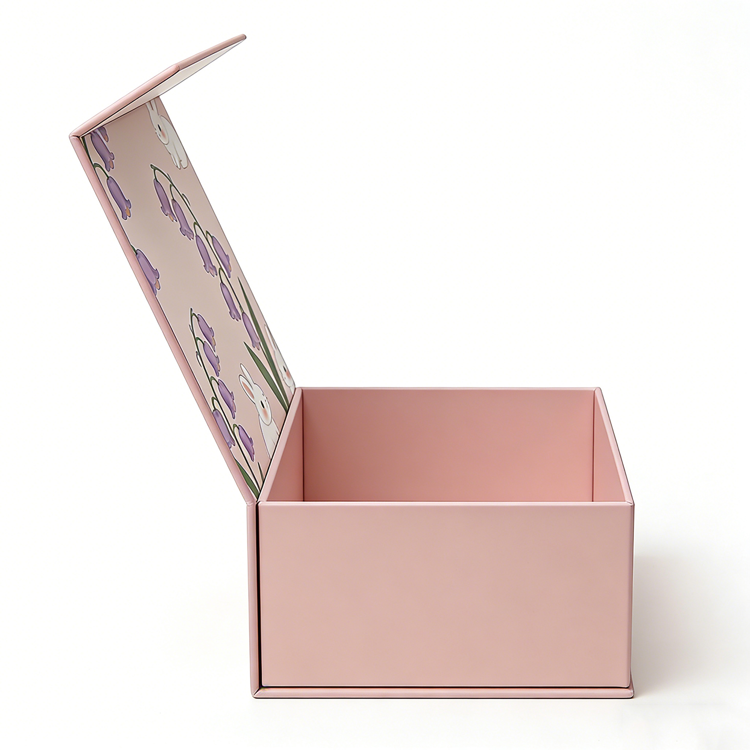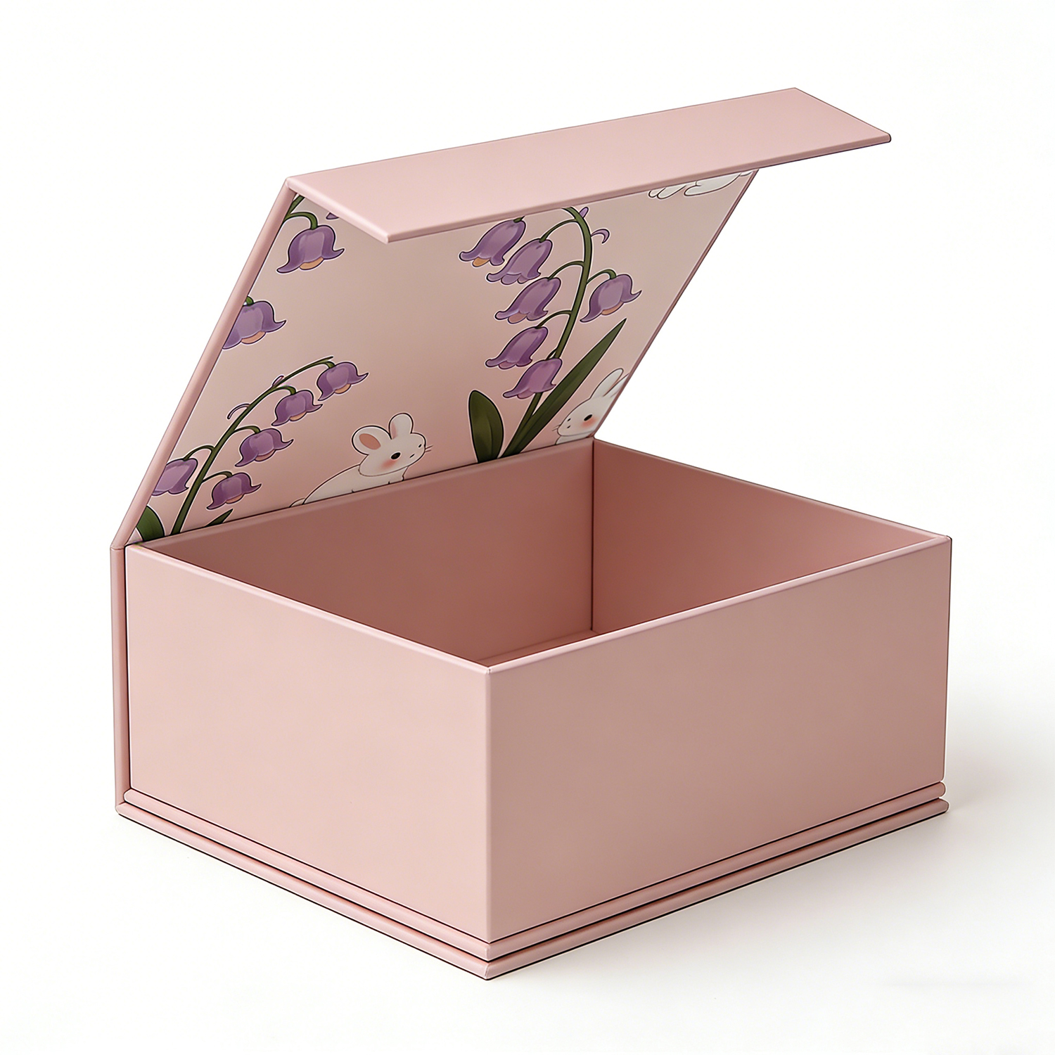 Designed to elevate the presentation of fine jewelry, this premium rigid box features a delicate pastel pink finish complemented by an enchanting interior illustration of soft florals and adorable bunny motifs.