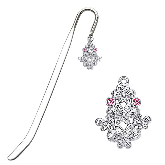 The clustered butterfly charm highlights two pink-colored embellishment stones to please eyes, dangling on the hooked finish of this bookmark. The metallic dragonfly design comes in a compact and thin construct for convenient page-marking in fiction, journal and more.
