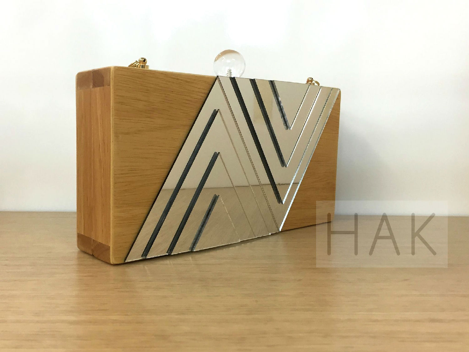 Minimal design matches gracefully with rectangular outline to give you this clutch bag of boxy create. The triangular mirror embellishments in the front further bring texture and pledge an edgy hint for the overall wooden convey. Compact in size, it is the perfect piece to complete your classy night-out appeal.
