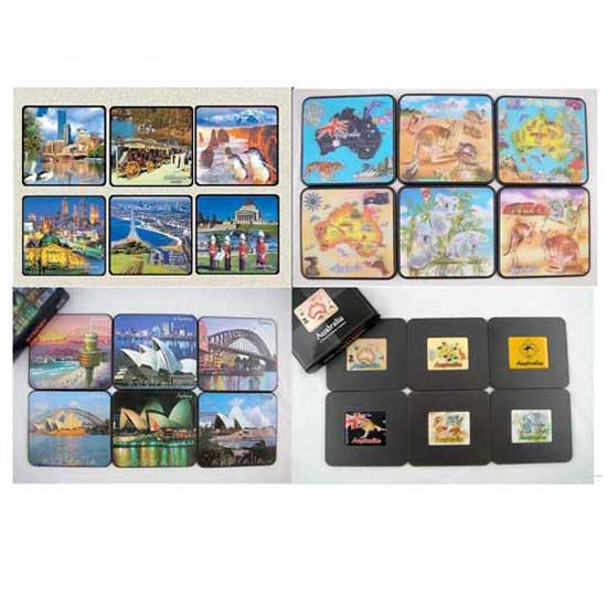Featured are coaster sets with different styles. Some showcase the landmarks of different countries, while others have representative animals of particular countries. The square-shaped coasters have round edges.