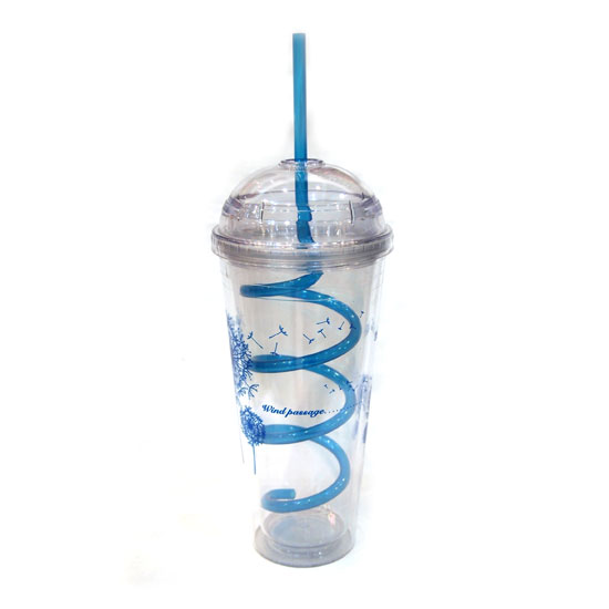 This transparent coffee cup can hold both cold and hot beverages. The travel cup is also designed with a transparent blue spiral straw, allowing convenient on-the-go drinking. This lightweight travel cup is easy to carry around.