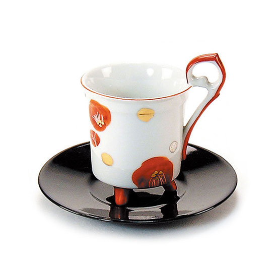 The coffee cup set comes with a three-legged coffee cup with red camellia on a black saucer. The ergonomic holder allows a firm and comfortable grip. Enjoy your relaxing tea time with this coffee cup set in the afternoon.