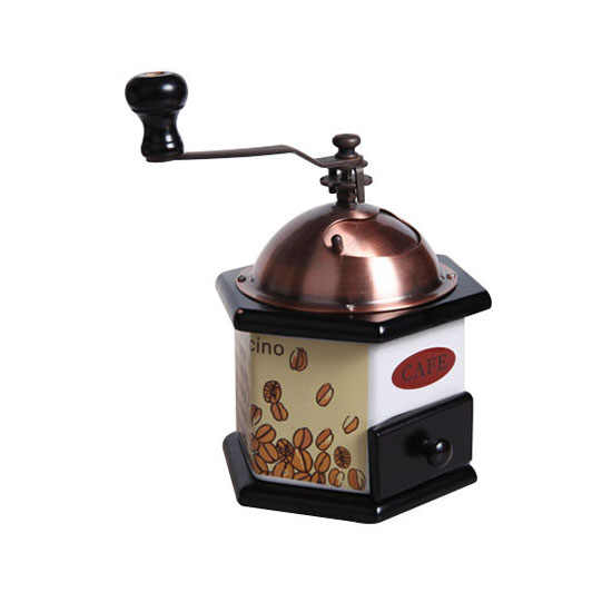 This is a manual coffee mill with a dainty and classic design. It features a strong structure with exquisite coffee bean prints. Made of high-quality material, this utensil ensures an extended service life.