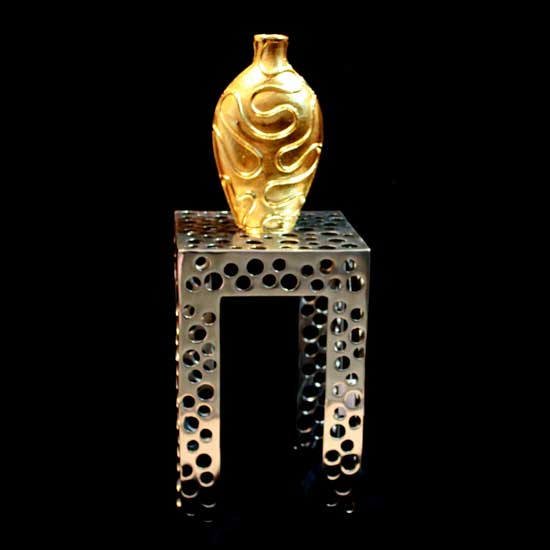This four-legged aluminum coffee table is accessorized with an exquisite vase. The stylish coffee table is designed with numerous holes on its body. The coffee table can easily blend into any modern home decor.