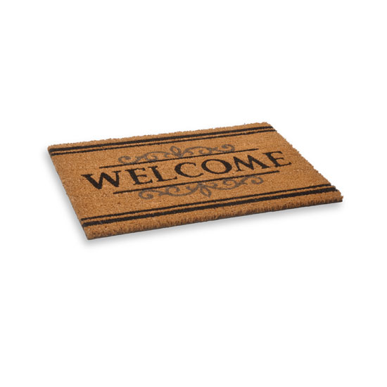 This coir door mat flaunts a low-profile charm with its brownish tone. It is printed with simple patterns and words for a modest touch. The vinyl backing greatly enhances its durability.