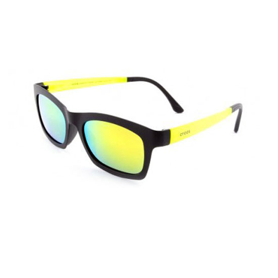 This pair of cutting-edge sunglasses features a stylish color-blocked design. The lenses are finished with a mirror coating for a contemporary touch. The yellow-colored temples match nicely with the yellow-hued lenses.