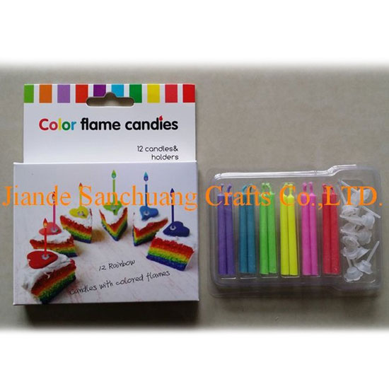 This is a pack of birthday candles including 12 candles and 12 holders. With amazing rainbow glow, the candles will add a cozy and warm touch to your birthday party. This pack of candles is made of non-toxic and eco-friendly material.
