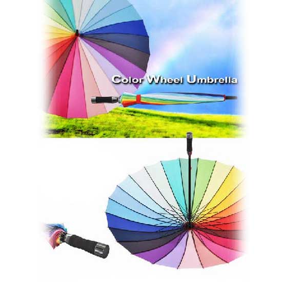 This stylish umbrella features a fabric canopy that has a color wheel design. The high-quality umbrella features durable construction. Its sturdy straight handle is comfortable to grip.