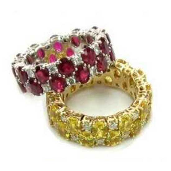 This ornate ring features a patterned stone setting design in two colors. The red and white stones complement each other for an extravagant, fancy style. An alternative design with yellow and white stones is also available.