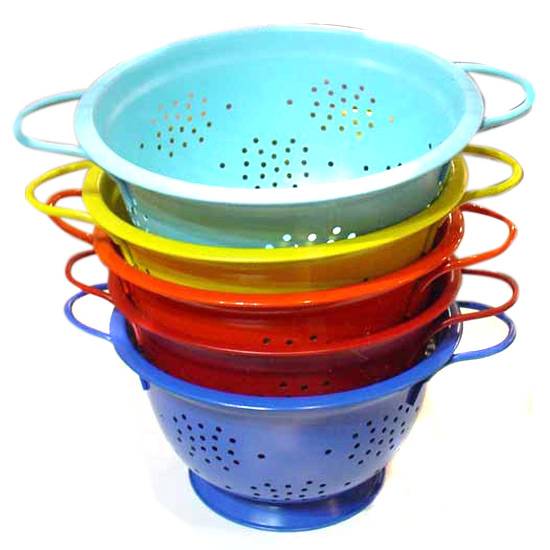 These are colourful colanders. The colanders come with various colours, such as light blue, blue, red, orange and yellow. The colander is a useful kitchen tool for straining. Theses colanders features with two handles on the two sides for convenient carrying. They can be stacked up as shown, in which they would not take up much space of your kitchen.
