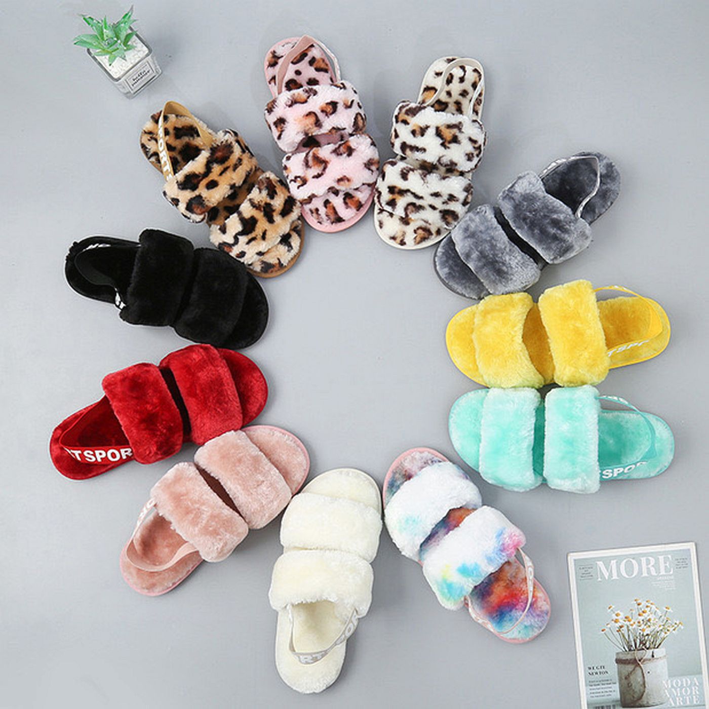 As shown is a colorful fluffy fur slippers with polyester materials.