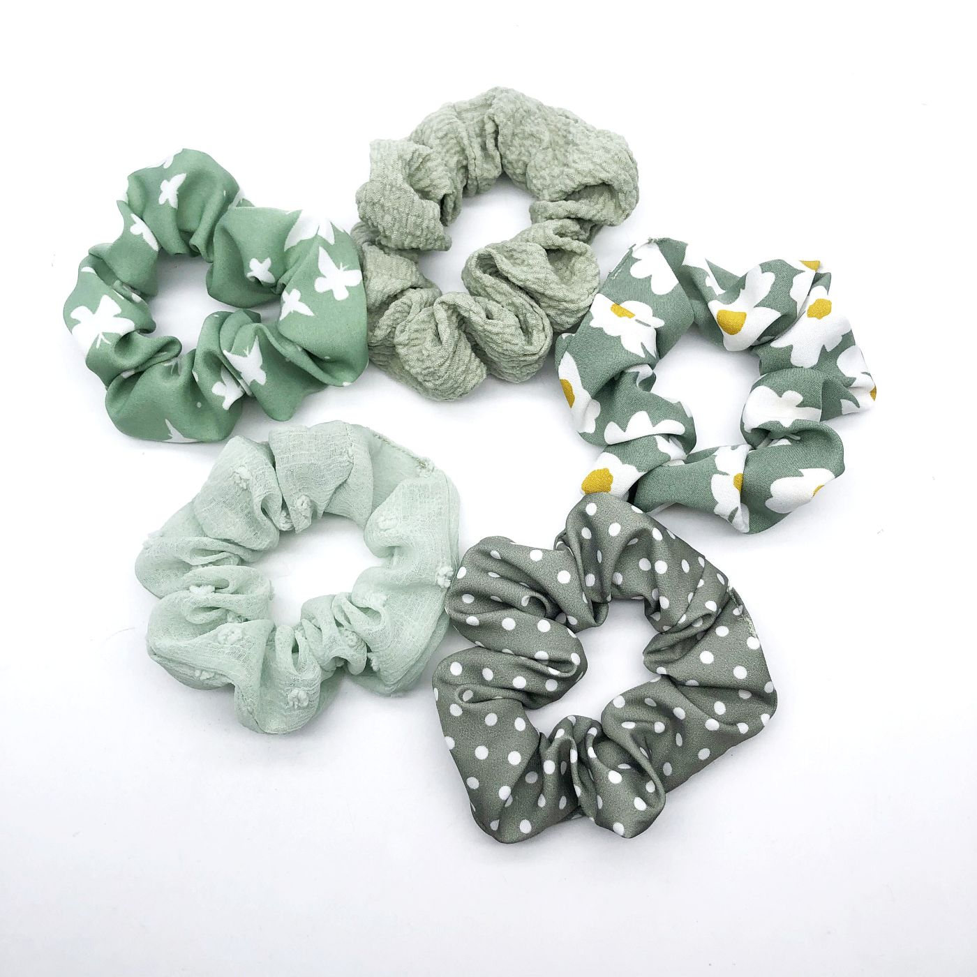 This is a set of five hair scrunchies in various shades of muted green and gray. They feature different patterns and textures: