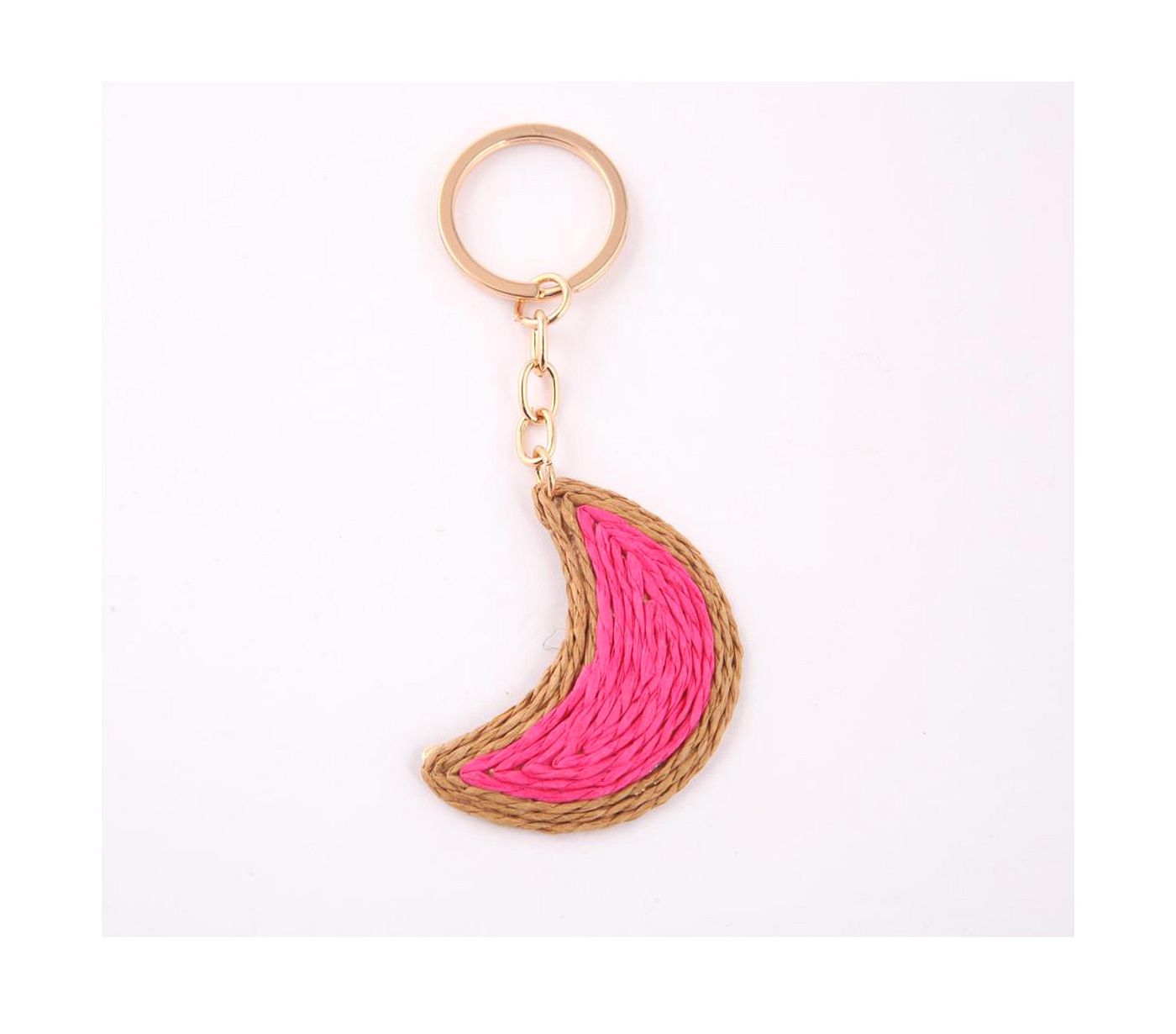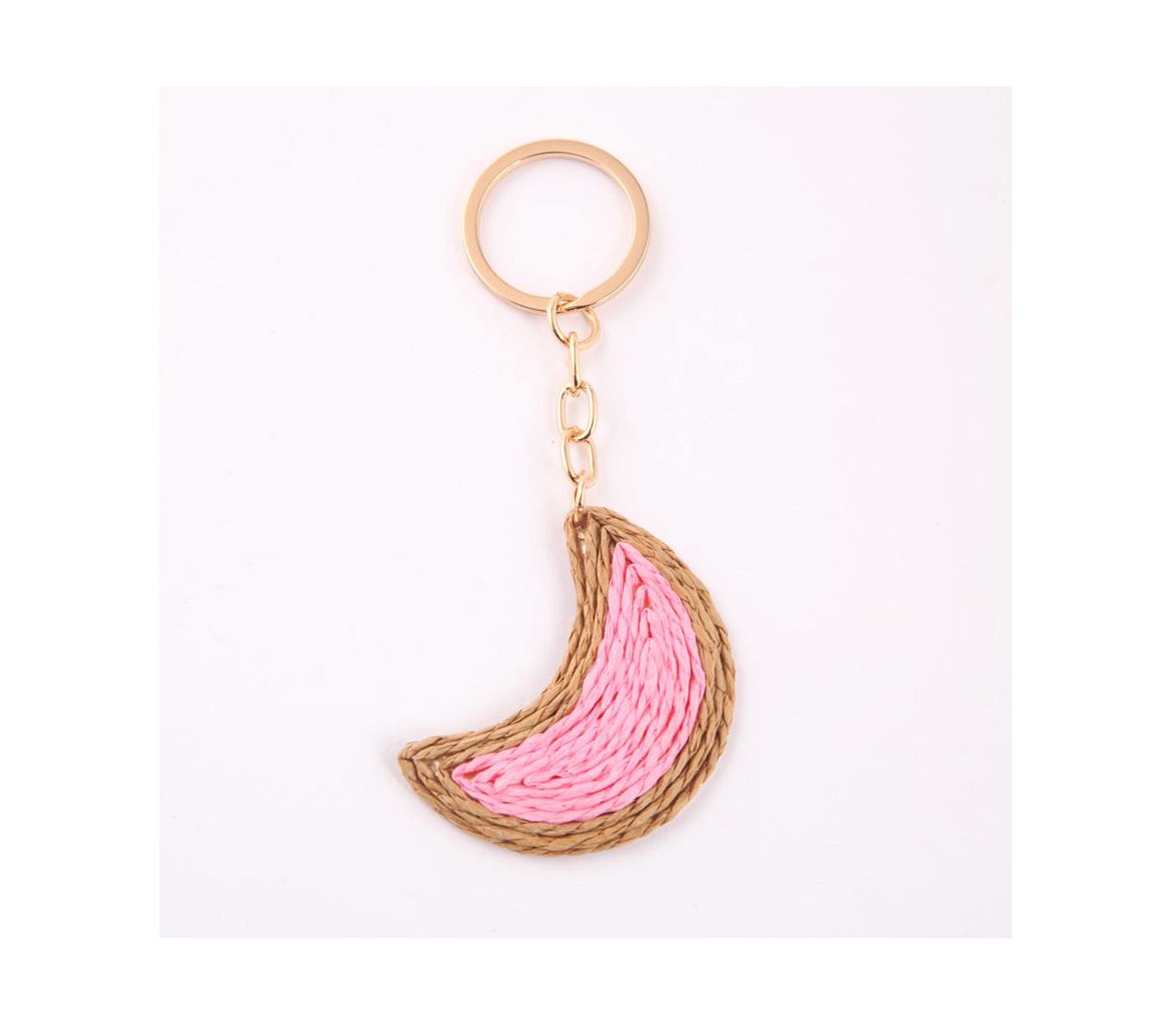 As shown is a high-fashion moon style weaved pattern golden plated key chain.