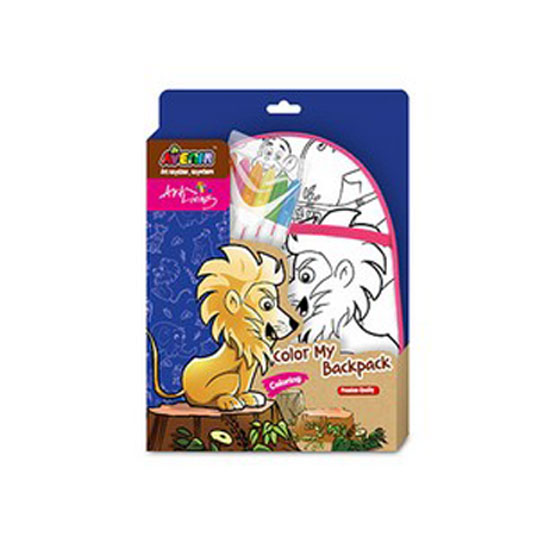 Displayed is a coloring toy comprising a plain backpack and color markers. The backpack is accented with a lion image for a lovable look. This coloring toy stimulates the visual development of your kid.