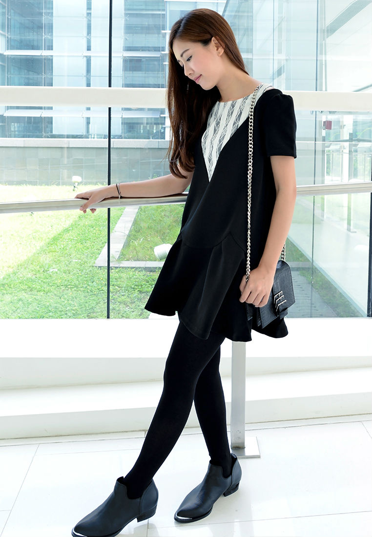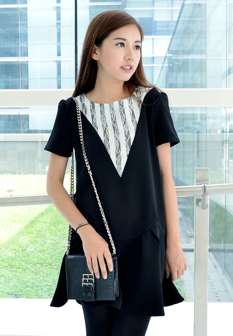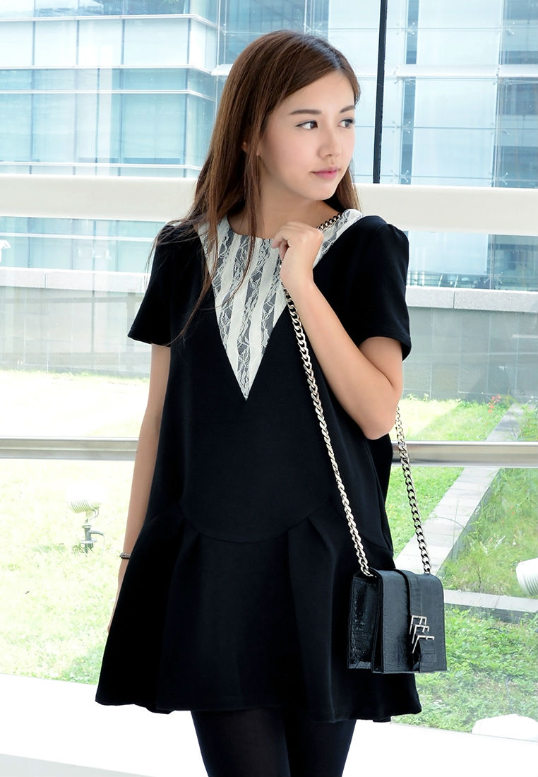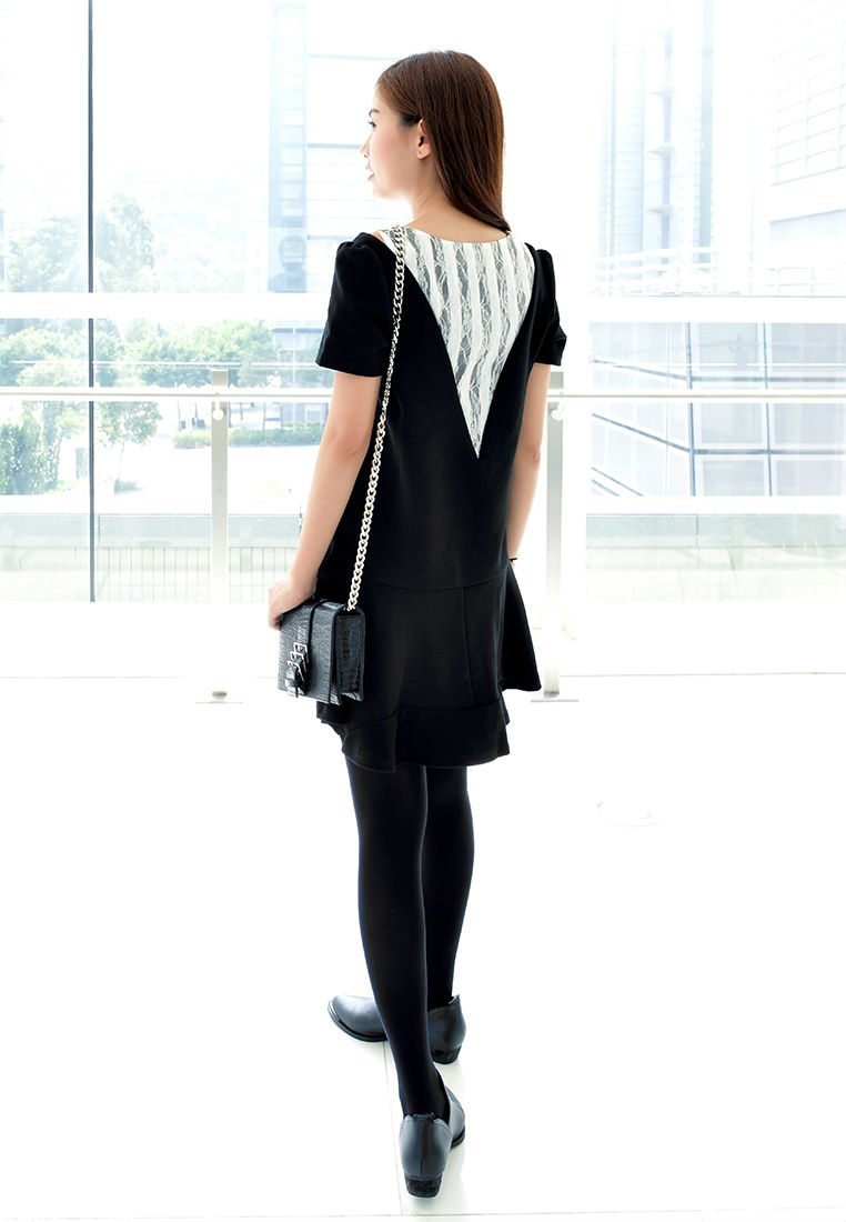 Imbued with girlish charm, this minimalist shift dress gives female a surprising, new direction. Embodying a simple shift silhouette and combined fabric, this piece is finished with a ruffle hem that adds movement and volume. And this elevates your look with a charming, youthful appeal.