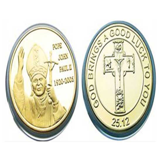 The coin is designed to commemorate Pope John Paul II. It features fine engraved patterns of the past Pope and a cross. The skilled craftsmanship gives it a delicate, polished finish.