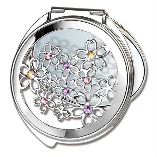 This classic compact mirror would be a nice gift for flower-loving friends. The exterior is well plated with nickel for long-lasting shine. Featuring stunning sakura openwork set off by sparkling colored stones, this mirror will add a touch of delicacy to your everyday essentials.
