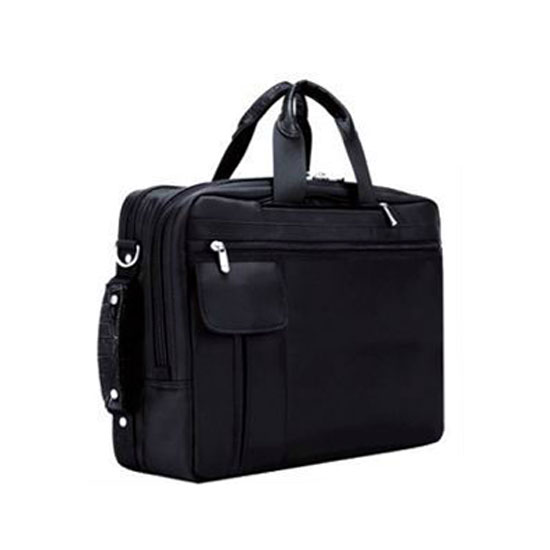This is a computer bag made of durable fabric. It features a big main compartment with a zip closure and multiple side pockets for storing related accessories. The durable handles are covered with smooth material for comfortable carrying.