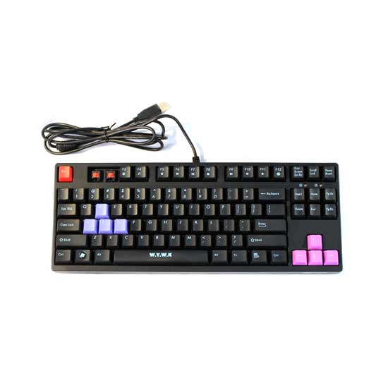 Displayed is a computer keyboard that comes in a black color. The arrow keys are designed in pink, the escape key in red, while the keys for the letter A, W, S and D are in purple. This keyboard is made of high quality material for durability and a comfortable touch.