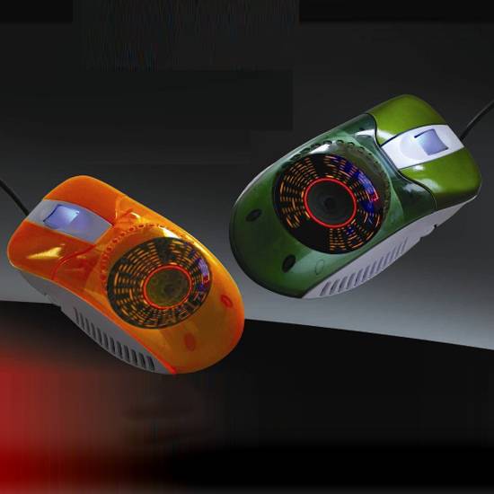 This is a computer mouse with a LED glittering unit which can show self-programmed messages. It also has a fan at the top for removing the sweat of the hand to keep it dry and cool.
