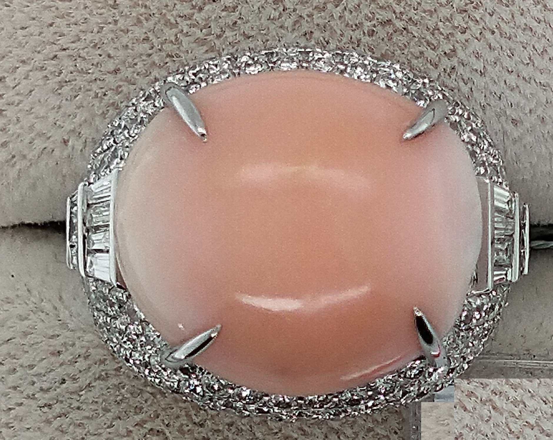 It is K18WG Conch Pearl Ring. Conch pearl is 26.84 carat , side stones are 0.44/2.16 carats. Total weight of the ring is 15.78 grams.