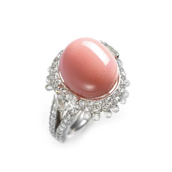 Celebrate your happily ever after with your prince charming with this conch pearl ring. It boasts to radiate scattering splendor at all directions with a sparkling row of diamonds wreathed neatly around the flawless conch pearl. Paved with diamonds along its split shanks, it is sure to lend an extra dash of shimmer to your ring finger.