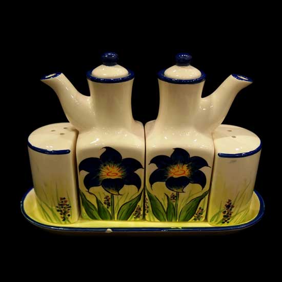 Featured is a 4-piece condiment set designed with a complementary dish. Simplistic floral graphics decorates the sauce dispensers and salt and pepper shakers. This delightful, practical set is an ideal choice for household and restaurants.