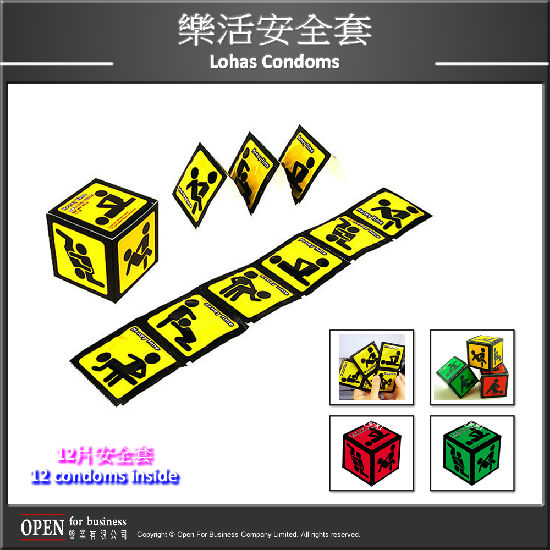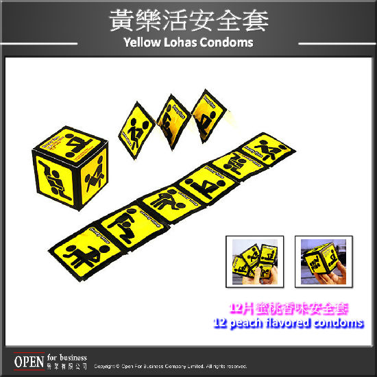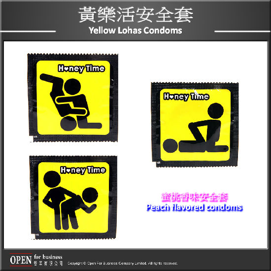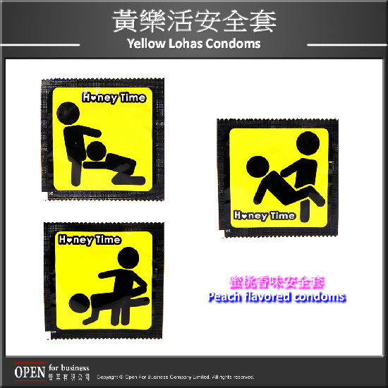 HoneyTime Yellow Lohas Condoms are packaged in a yellow-themed Lohas box depicting cute illustrations of fun sex positions. Each lubricated HoneyTime Yellow Lohas condom (total of 12 per box) are 3-in-1 styled (ribbed + contura + dotted) and peach flavored (52+/-2mm), separately sealed in wrappings with cute illustrations of fun sex positions. Want inspirations?
