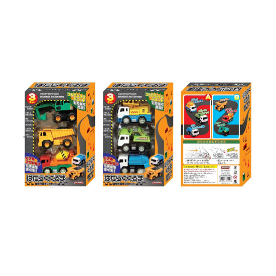 This is a collection of construction toy machines that comes in a window box. Each featuring three different types of vehicles, this toy set is fun to play with. The toys are friction-driven for durable playing.