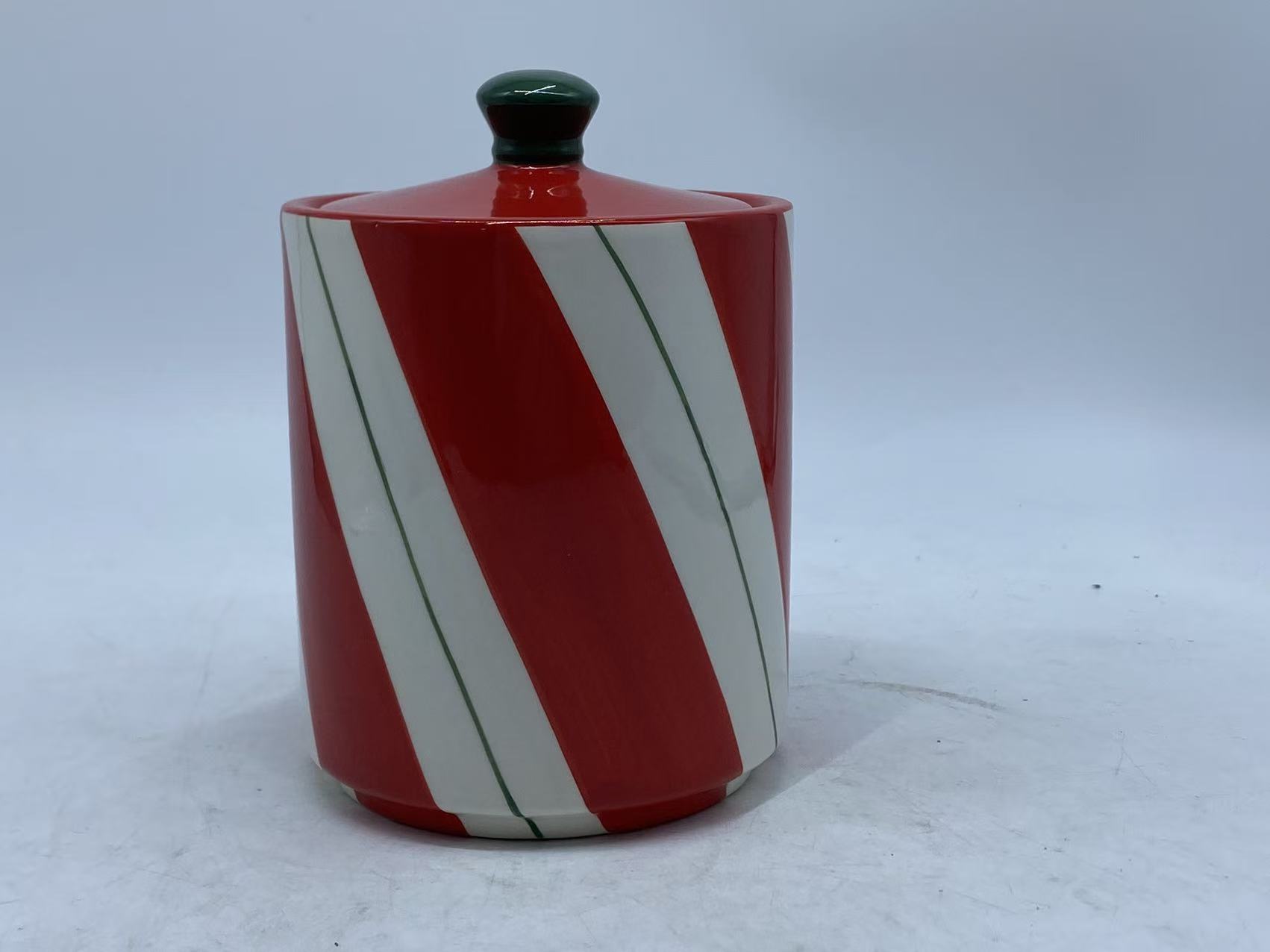 This is a cookie jar with red and white line shape, made of high-quality Dolomite (ceramic) material, featuring a delicate texture and durability, which is suitable for daily home use.