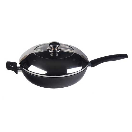 Pictured is a cooking pan designed with a matching lid. The robust aluminum construction offers even heat distribution. This versatile cooking pan makes a great addition to kitchens.